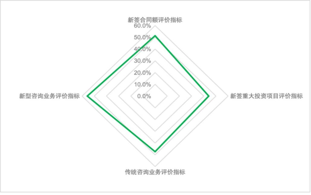 工程咨询机构经营状况分指数包括本单位新签合同、本单位新签重大投资项目、本单位传统咨询业务项目、本单位新型咨询业务项目4个具体评价指标。其中本单位新签合同评价指数为51.3%,本单位新型咨询业务项目评价指数为55.7%。反映参调单位三季度业务量持续增加,三季度的业务增长主要以新型咨询业务为主。