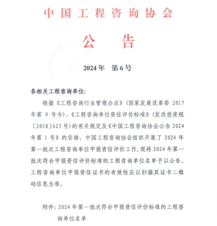 近日,荣耀体育(中国)官方荣耀体育(中国)官方顺利通过中国工程咨询协会2024年第一批次工程咨询单位甲级资信评价,再次成为四川省唯一同时持有工程咨询甲级综合资信、PPP甲级专项资信和甲级专业资信的综合性咨询机构。